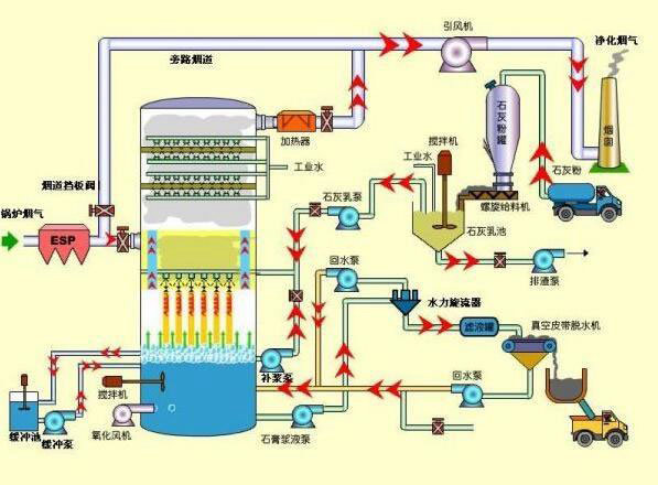 ? ? ? ?石灰石-石膏濕法脫硫工藝采用價(jià)廉易得的石灰石作脫硫吸收劑。將石灰石粉與水混合攪拌制成石灰石漿液,石灰石漿液經(jīng)泵打入吸收塔與煙氣充分接觸,使煙氣中的二氧化硫與漿液中的碳酸鈣進(jìn)行反應(yīng)生成亞硫酸鈣,從吸收塔下部漿池鼓入氧化空氣使亞硫酸鈣氧化成硫酸鈣,硫酸鈣達(dá)到一定飽和度后,結(jié)晶形成二水石膏。從吸收塔排出的石膏漿液經(jīng)濃縮、脫水,使其含水量小于10%,然后用輸送機(jī)送至石膏貯倉堆放。脫硫后的煙氣經(jīng)過除霧器除去霧滴后,由煙囪排入大氣。